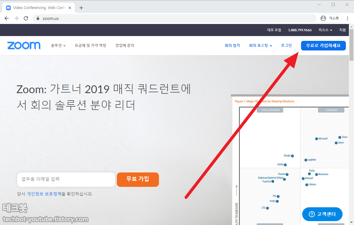 https://zoom.us/ 사이트로 접속한 후에 “무료로 가입하세요”버튼을 누릅니다.