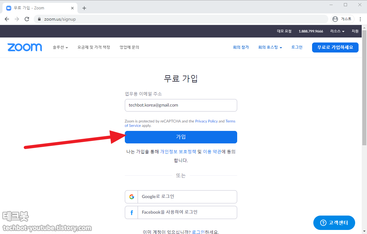가입할 이메일 주소를 적은 후에 가입 버튼을 클릭합니다.