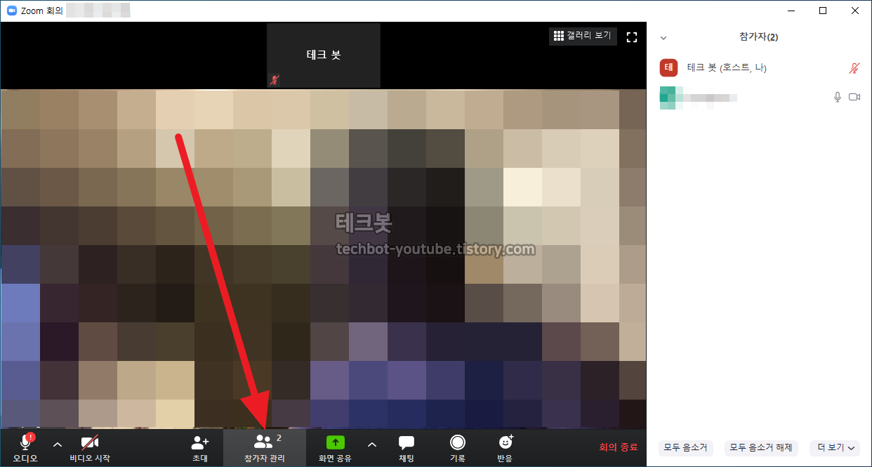 호스트에 참가자 관리 버튼을 누르면 오른쪽에 참가자들이 표시됩니다.