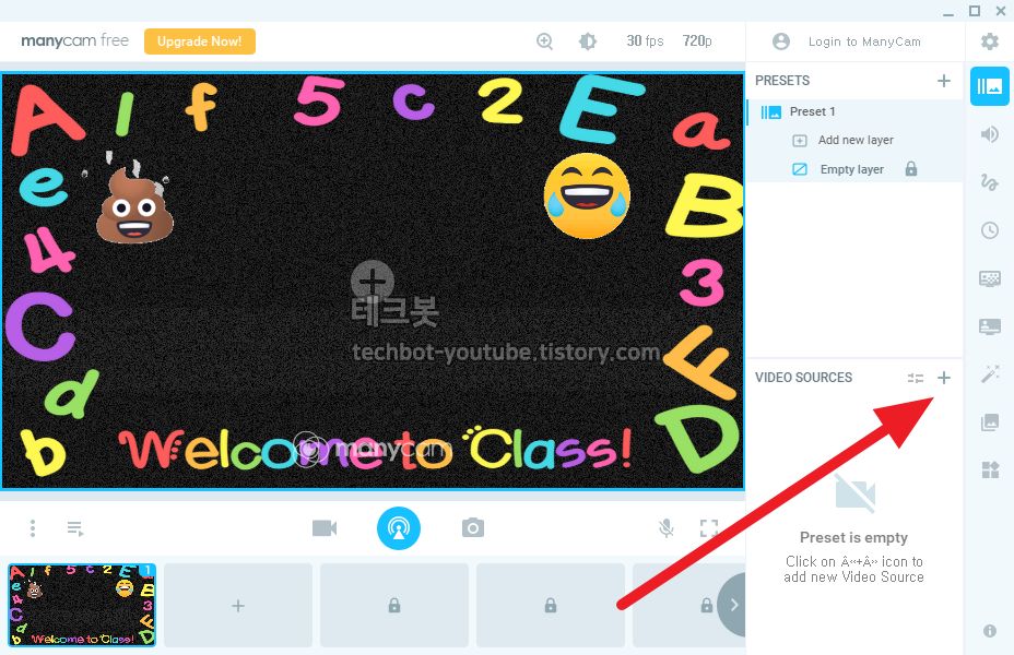 컴퓨터에 캠이 있으면 캠화면을 꾸미는것도 가능합니다. VIDEO SOURCES 에 +버튼을 클릭합니다.