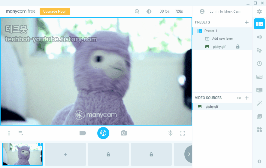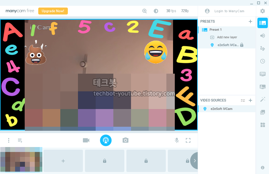 매니캠은 가상 카메라 프로그램 입니다(실제 카메라도 같이 사용 가능합니다). 매니캠을 이용하면 위와같은 화면으로 화상회의를 할 수 있습니다.