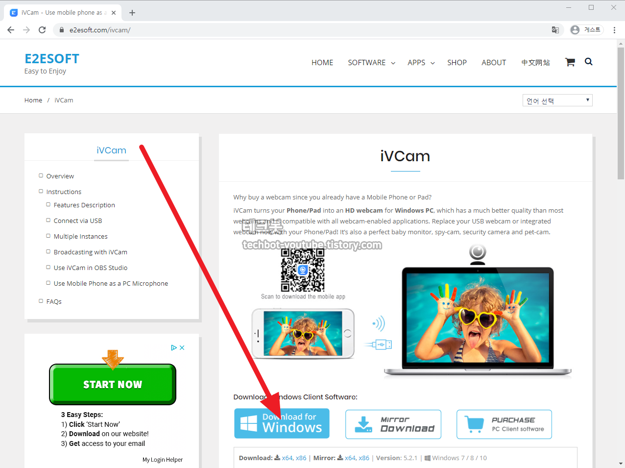 웹 브라우저로 https://www.e2esoft.com/ivcam/ 에 접속한 후에 Download for Windows를 클릭해서 프로그램을 다운로드 한 후에 설치합니다.