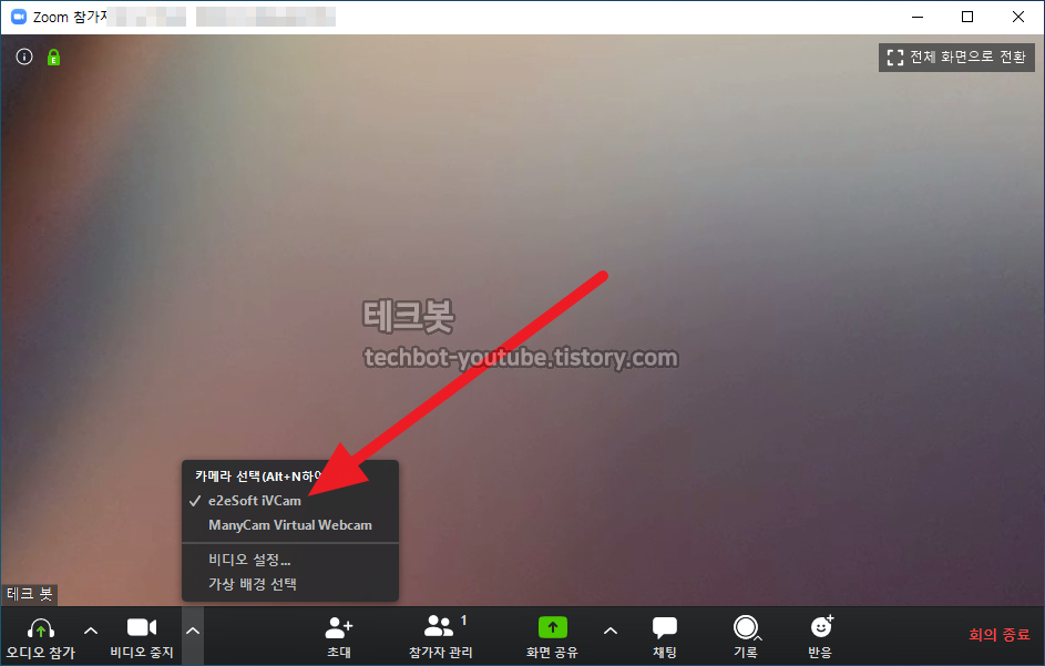 비디오 시작(중지) 옆 화살표를 누르고 e2esoft iVCAm을 선택하면 비디오 회의를 할 수 있습니다.