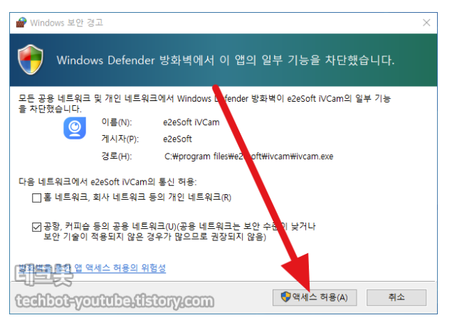 설치후에 실행하면 이런 경고가 나오는데 엑세스를 허용합니다.
