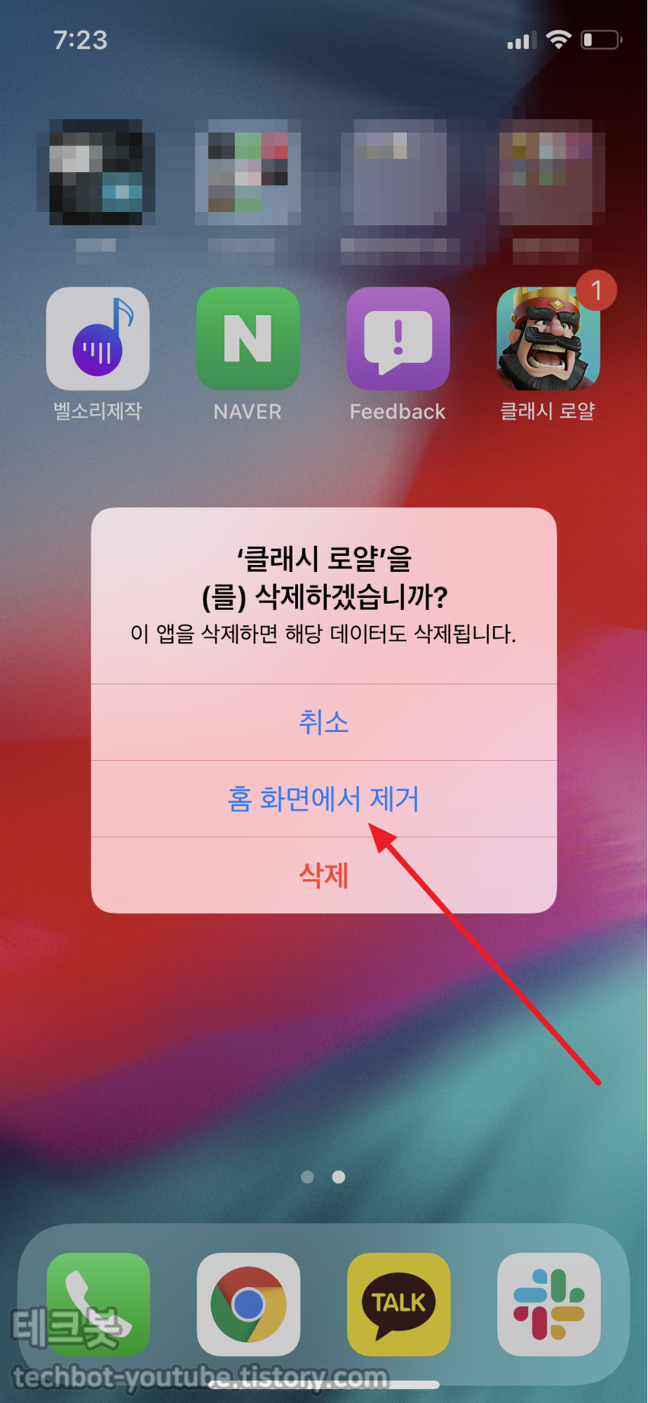 홈 화면에서 제거 버튼을 터치합니다. 홈 화면에서 제거하면 실제 앱이 제거되는게 아니고 숨기기만 됩니다.
