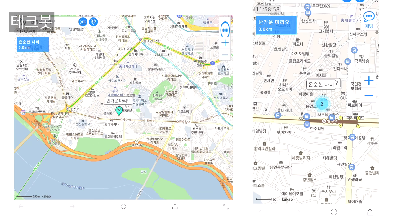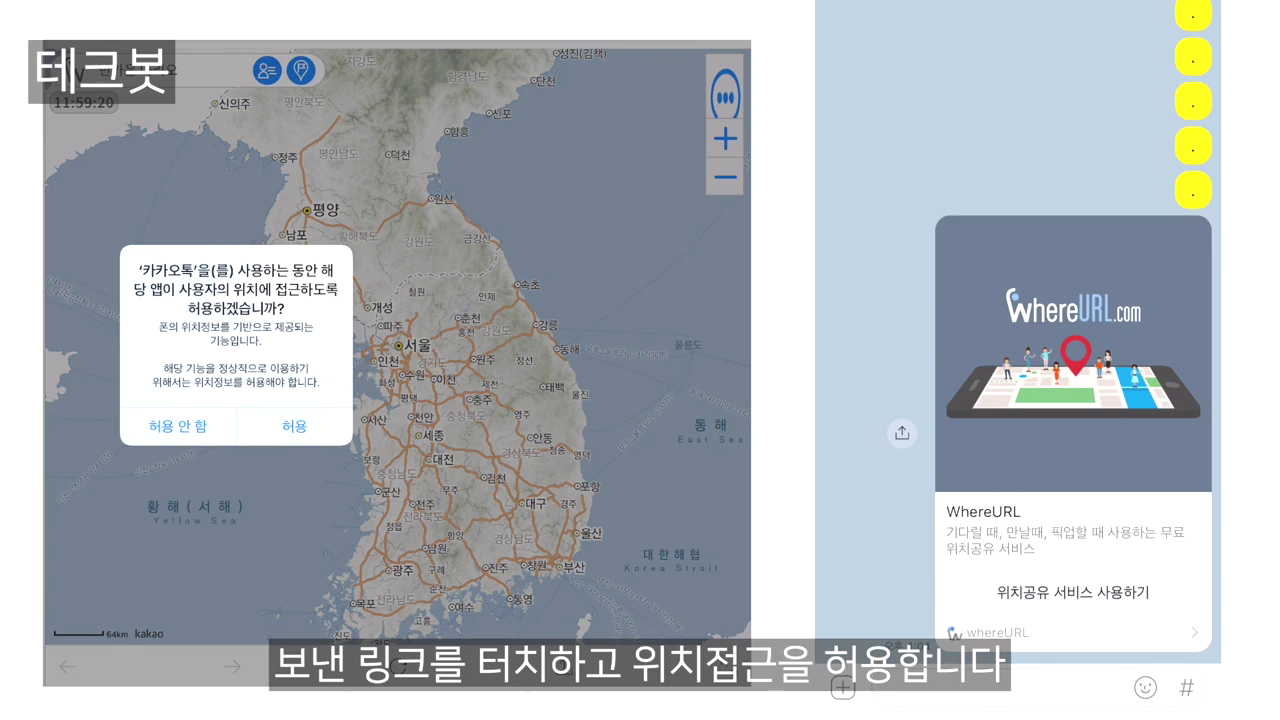 저는 제 자신에게 보내서 테스트 했습니다. 왼쪽 화면은 받은쪽 화면이고 오른쪽 화면은 보낸쪽 화면입니다. 보낸 링크를 터치하고 위치접근을 허용합니다.