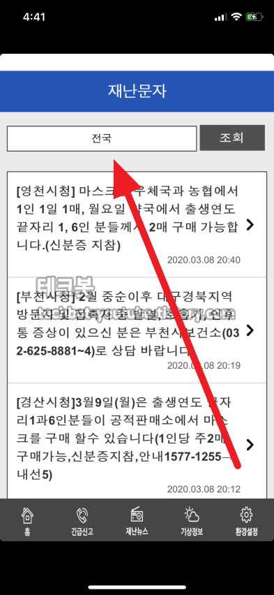 재난문자 리스트에서 지역 버튼을 눌러서 원하는 지역 재난문자도 확인이 가능합니다.