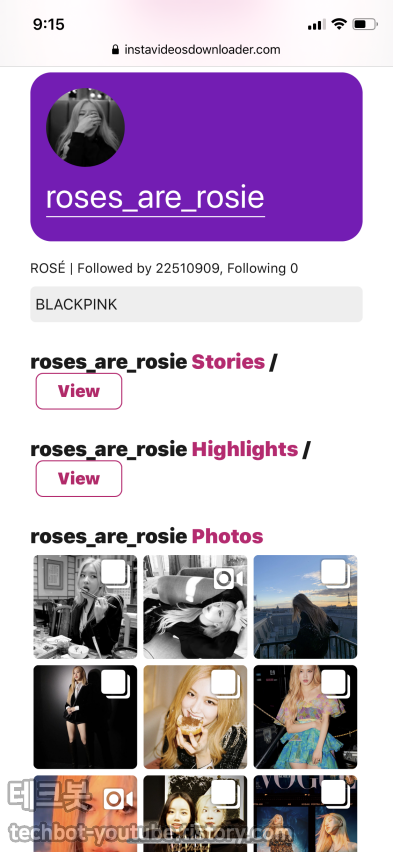 접속에 성공하면 인스타그램과 똑같은 구성을 볼 수 있습니다. Stories, Highlights 부분에 View를 누르면 스토리와 하이라이트를 확인할수도 있습니다.