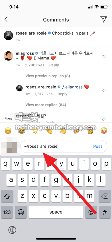 댓글을 달 수 있는 창이 나오면서 아이디가 표시됩니다. 골뱅이 모양(@)을 제외하고 아이디만 복사합니다. 아이디를 알고 있다면 이 단계는 스킵할수 있습니다.