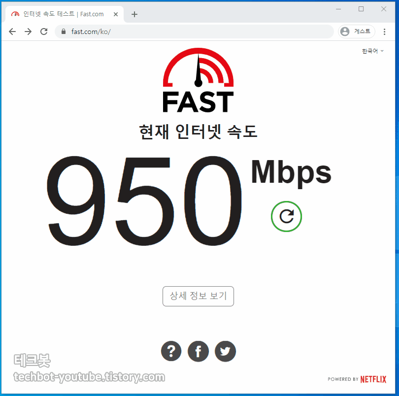 넷플릭스에서 개발한 속도측정 사이트 입니다. 페이지에 접속하자마자 다운로드 속도가 측정 됩니다. 실시간으로 속도가 얼마나 나오는지 체크하기 좋습니다.
